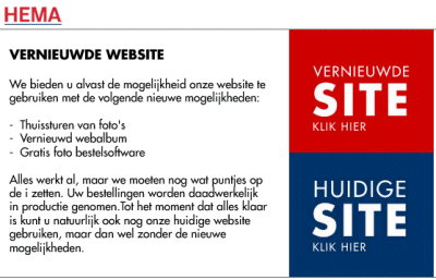 Hema.nl is vernieuwd en op het eerste oog zijn er weinig spectaculaire wijzigingen, maar één ding valt direct op. Ze bieden nog steeds de oude website aan!! Een heldere duidelijke tekst op de startpagina met een keuze voor de nieuwe én oude website. In de nieuwe website zit ook duidelijk het woord 'beta' vermeld, zowel onder het logo als in de URL. Of het echt verstandig is, dat vraag ik me af, maar eerlijk zijn ze wel.
