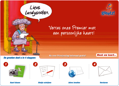 Vanochtend werd er op radio538 gesproken over de actie om Balkenende een kaartje te sturen. "Ga snel naar balkenende.nl en stuur een kaart. Wij leveren de kaarten morgen bij de premier af." Meteen naar de website gegaan en deze ziet er goed uit. Het ontwerp is speels en aantrekkelijk en nodigt meteen uit om een kaart te sturen. En het versturen van de kaart is nog gratis ook. Het leuke concept is van Greetz.nl, die hun positie in de markt voor kaartenservices aan het versterken zijn. De domeinnaam hebben ze voor een dagje gehuurd van een hoveniersbedrijf omdat de domeinnaam 'stuureenkaartnaarbalkenende' pas om 10.00uur kan worden vrijgegeven en ingericht.